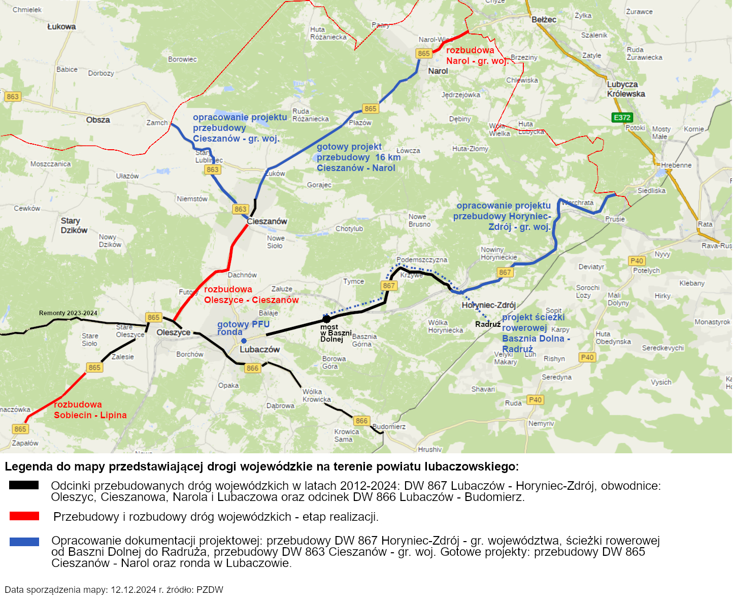 W ramach zadań Podkarpackiego Zarządu Dróg Wojewódzkich, realizowane są roboty drogowe na drogach wojewódzkich nr 866, 867, 865 i 863 w powiecie lubaczowskim oraz w jego kierunku na drodze wojewódzkiej nr 865 od Jarosławia do Cieszanowa. Działania te podejmowane są z wykorzystaniem środków z budżetu województwa, wkładów gmin i/lub dofinansowań z programów unijnych (Fundusze Europejskie dla Polski Wschodniej 2021-2027) i krajowych (Rządowy Fundusz Polski Ład: Program Inwestycji Strategicznych). Wszystkie działania poprawiające jakość infrastruktury drogowej, wpływają na rozwój regionu przede wszystkim przez lepszą dostępność transportową, szybszy czas przejazdu, komfort i bezpieczeństwo podróży.